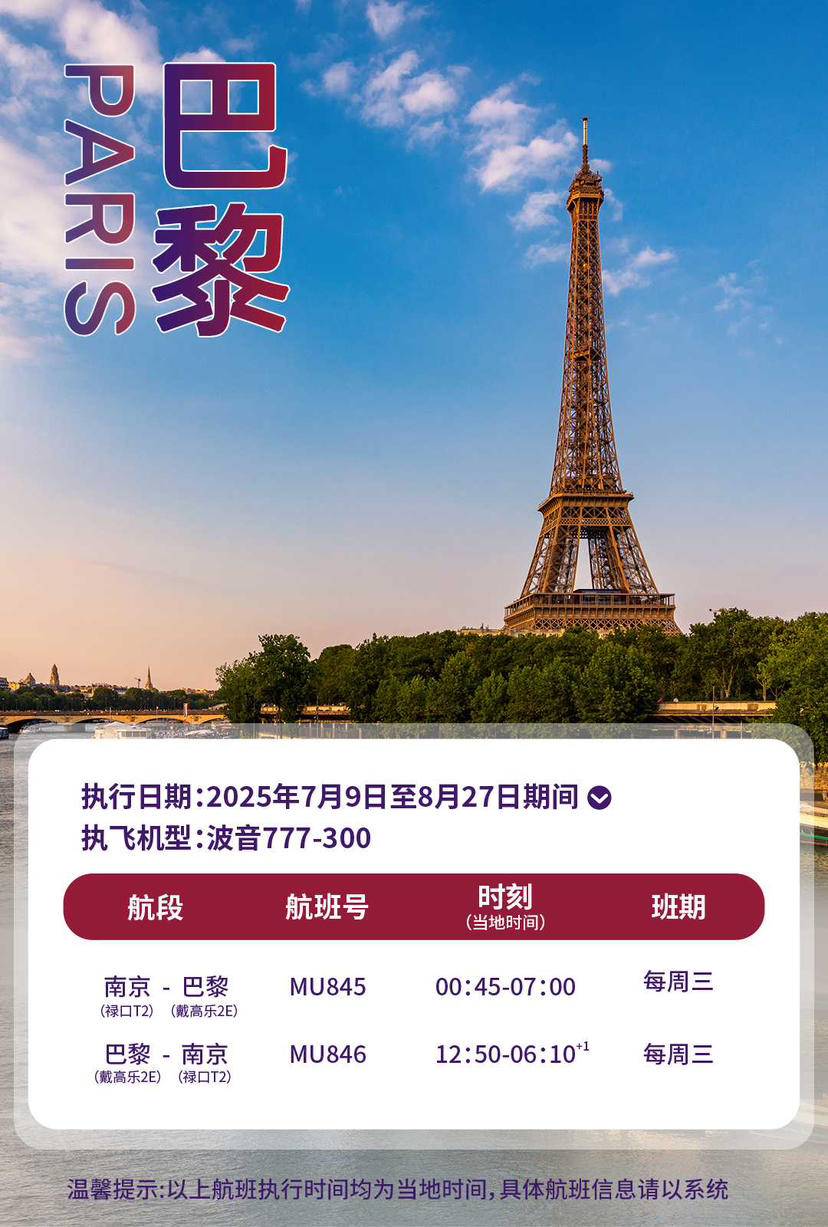 南京新增直飞巴黎航线,7月9日启航